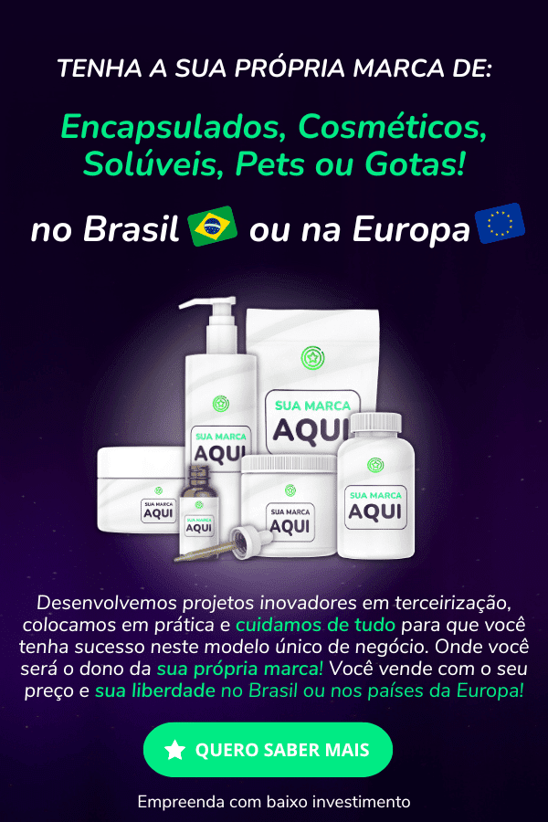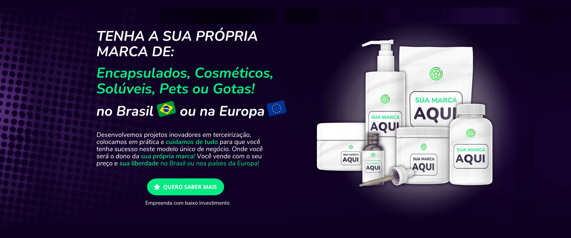Somos especialistas em terceirização no modelo full service 4.0! Temos fábrica própria nos suplementos alimentares, e fábricas parceiras homologadas para que possamos realizar o seu sonho em ter a sua marca própria e com baixo investimento. Cuidaremos de tudo, deste a concepção da ideia, no nome da sua marca, no desenvolvimento da terceirização, nos processos legais, e na construção do seu negócio online, com landingpage exclusiva e copys personalizadas, blog de conteúdo, aplicativo e checkout exclusivo, tudo na sua marca!